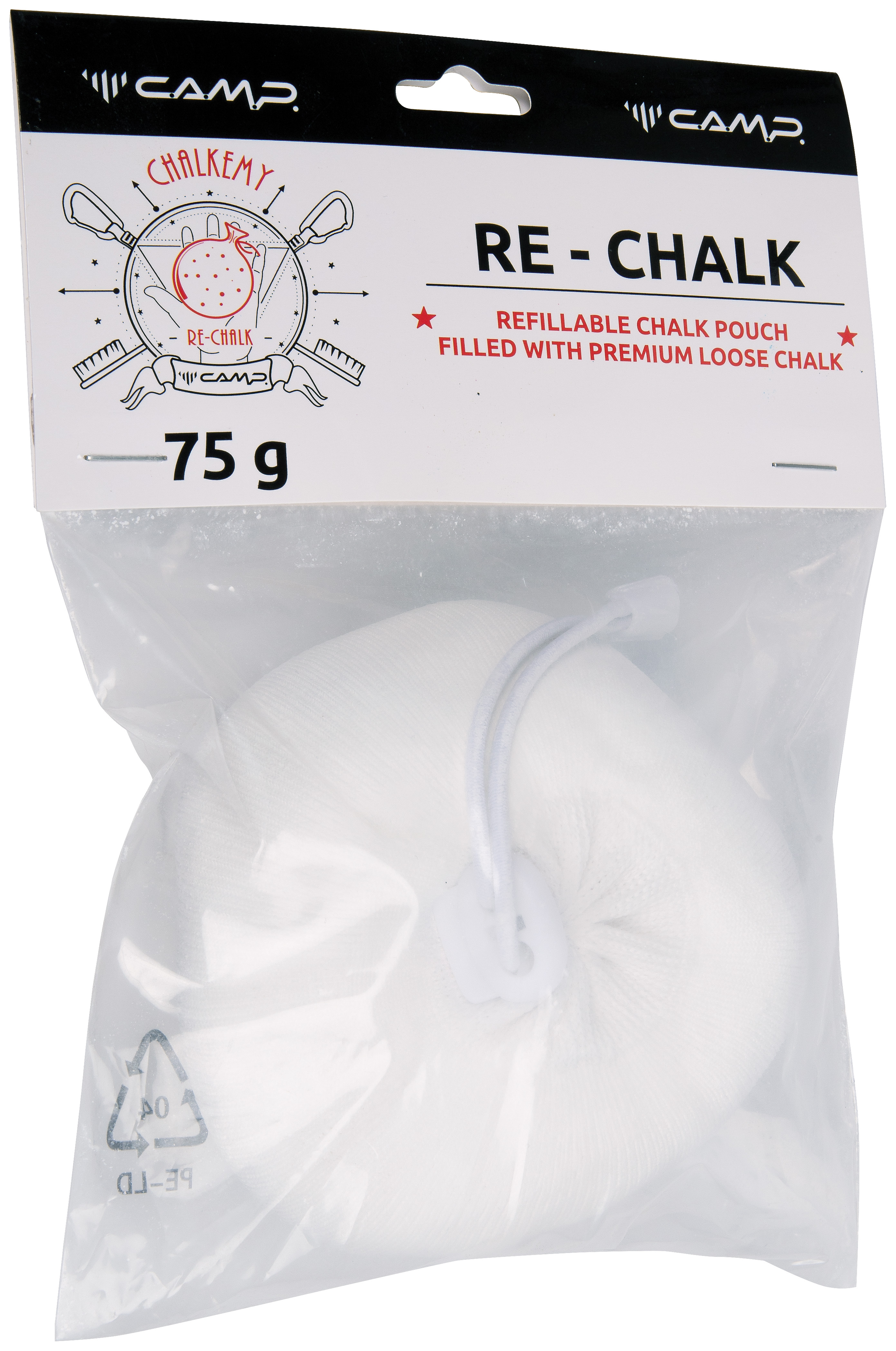 Refillable chalk pouch filled with 75 grams of premium loose chalk. Packed in a mesh net, it is the right solution for keeping chalk pollution to a minimum. Ideal for climbing gyms and home walls.
