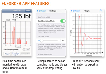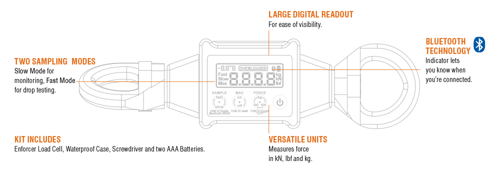 This compact device can measure force up to 20 kN, and with two sampling modes, the ENFORCER LOAD CELL monitors systems and logs drop testing in high resolution. Along with unique features such as Bluetooth connectivity and swivel attachment points, the Enforcer stands in a class of its own.