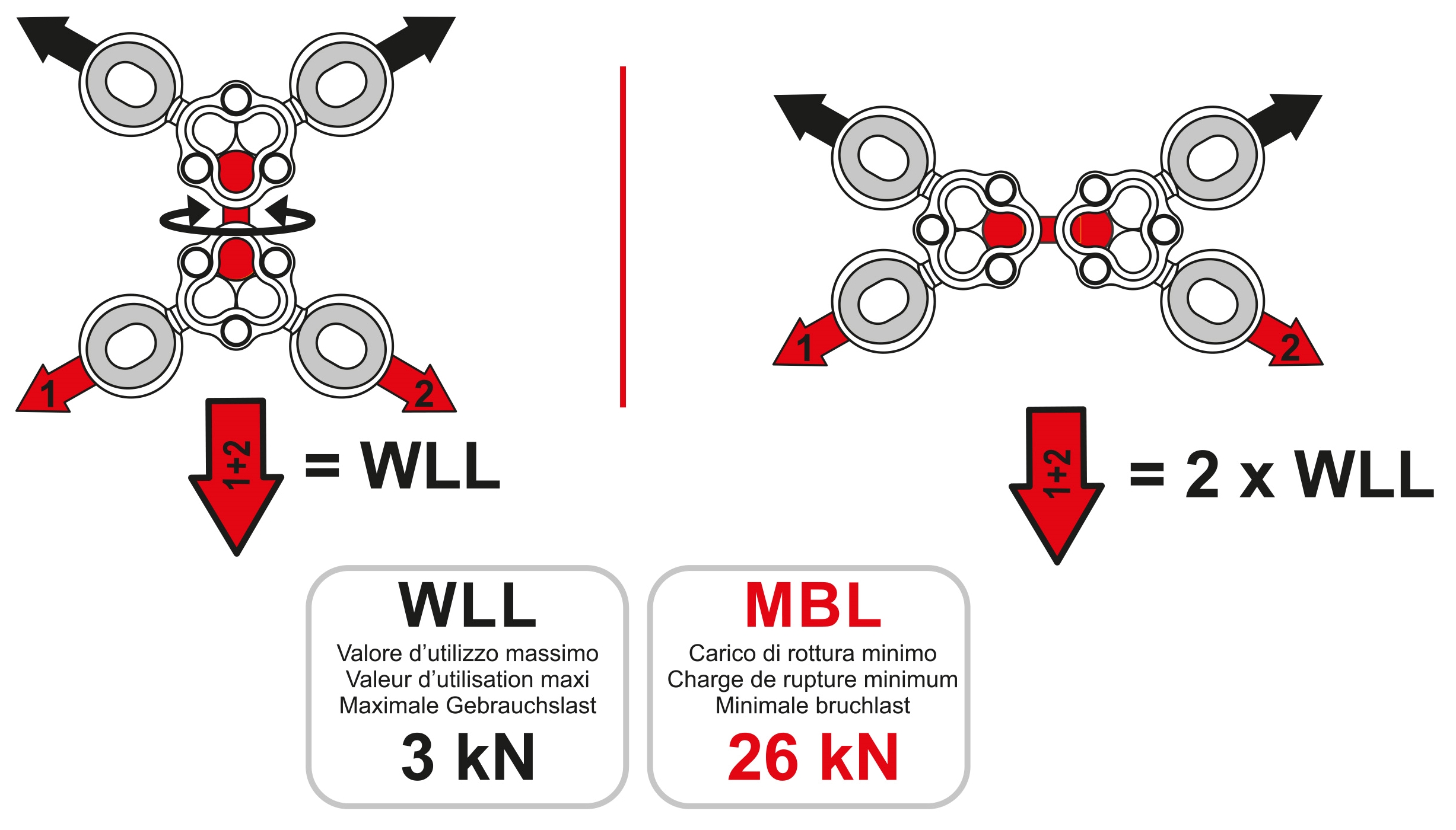 The Gyro4 system allows for countless possibilities of connection between different elements that need freedom of movement. The innovative design prevents the accumulation of dirt and makes inspection easy. Main structural flanges are carbon steel with a double corrosion preventive coating. Swivel balls and attachment points are stainless steel. Includes four removeable silicon anti-rotation inserts. Working load limit: 3 kN. Minimum breaking strength: 26 kN. Working load limit and minimum breaking strength are doubled when the two main bodies are oriented horizontally.