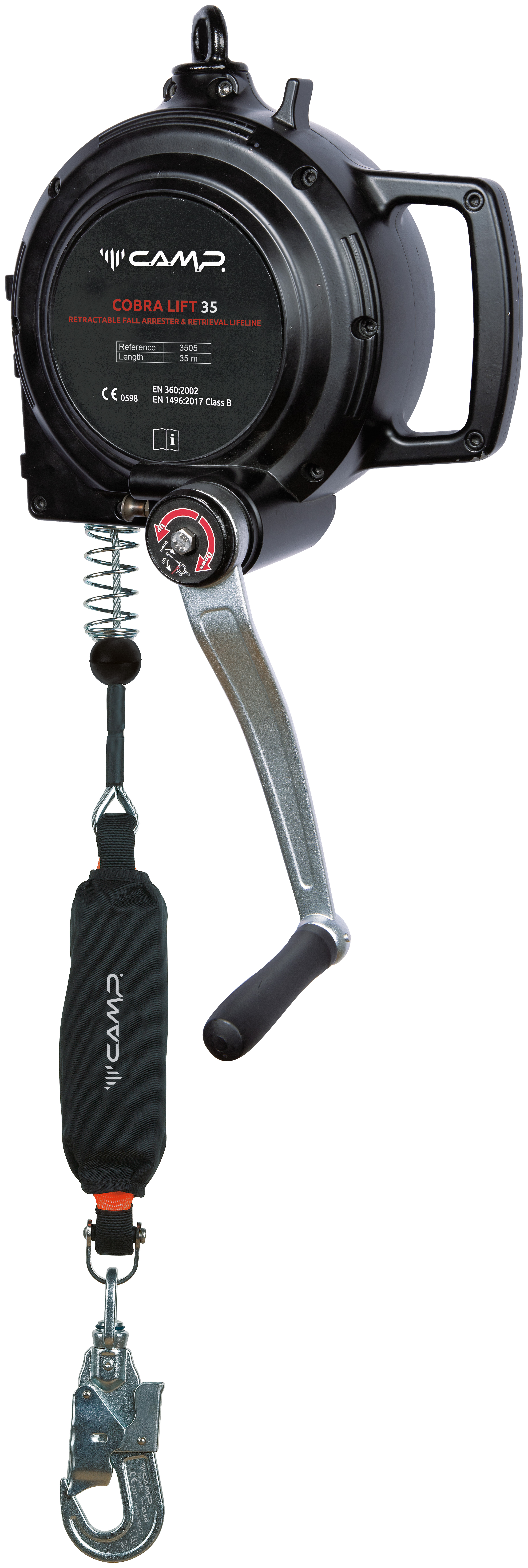 Self-retracting fall arrester with a cable length of 35 m, equipped with handled mechanism for retrieval.