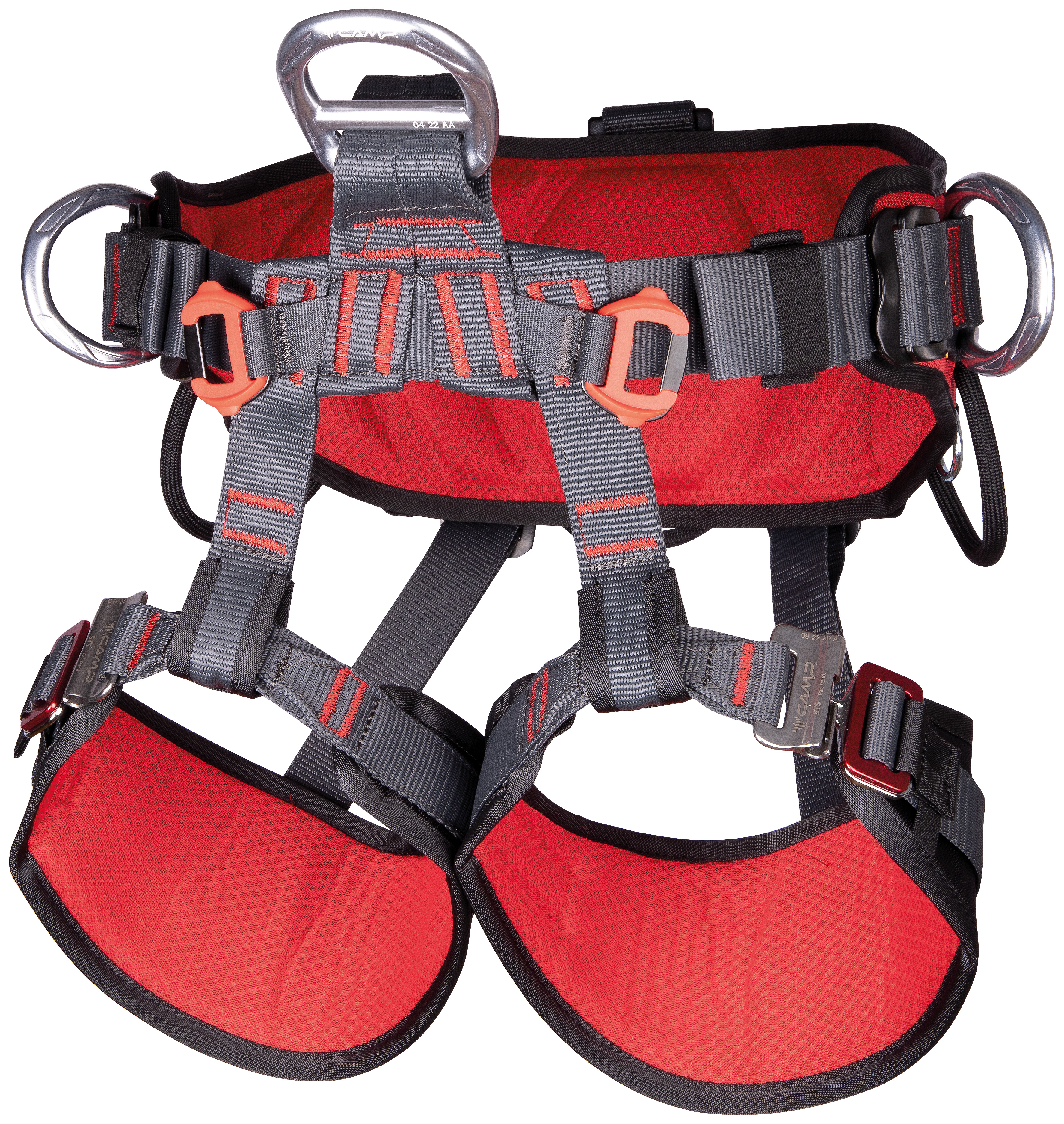 The waist belt and leg loops are made of ergonomic thermoformed padding to offer broad structural support and are connected by optimally spaced connection straps that give the harness a precise and comfortable fit.