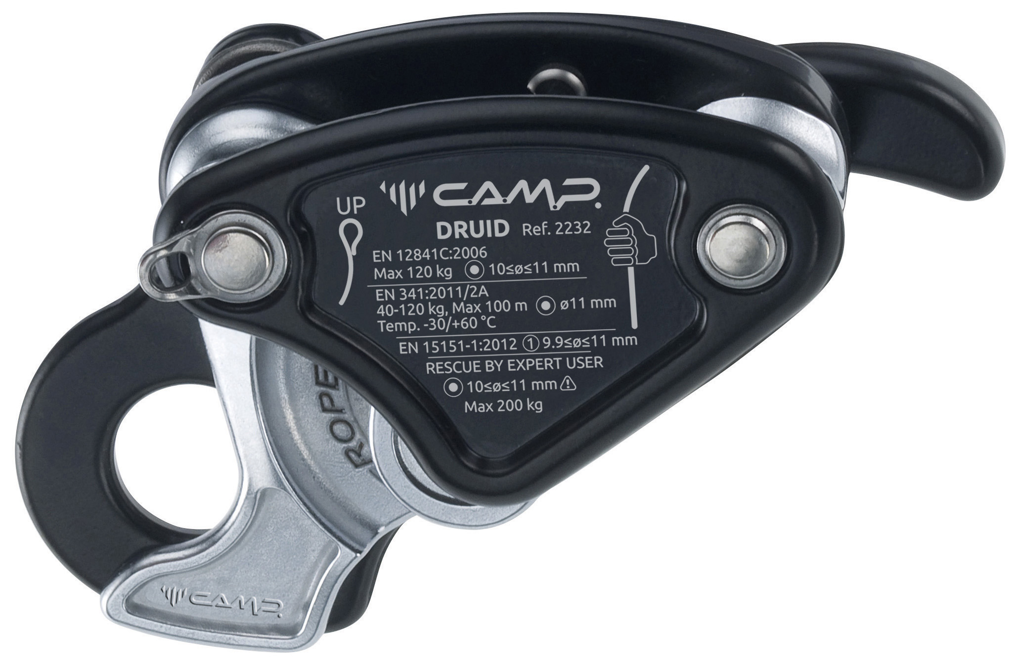 A lightweight, compact auto-braking descender for rope access and rescue designed for semi-static ropes ranging from 10-11 mm. Anti-panic function in the lever re-engages the cam if the handle is pulled too far where it could lead to unsafe descent speeds. The body and lever are made of robust hot-forged aluminum alloy. Mechanical parts are made of precision-cast stainless steel. The internal mechanism and locking cam use a innovative design for smooth action on the rope which prevents rapid wear-and-tear and absorbs energy from small shocks with a slight amount of rope slippage. The fluid action on the rope also allows the Druid to function well for rope ascent. The cam can be de-activated with a trigger to allow quick sliding of the rope in situations with no load or limited load. Steel ring for attaching a keeper cord. Standards: - EN 12841/C as a descender of the working line for workers up to 120 kg; can also be used for rope access rescue up to 200 kg. - EN 341/2A as an emergency evacuation device on a single line for workers up to 120 kg, 11 mm semi-static rope (Lithium 11 mm). - EN 15151-1 for climbing structures using mountaineering techniques with dynamic ropes ranging from 9.9 to 11 mm.