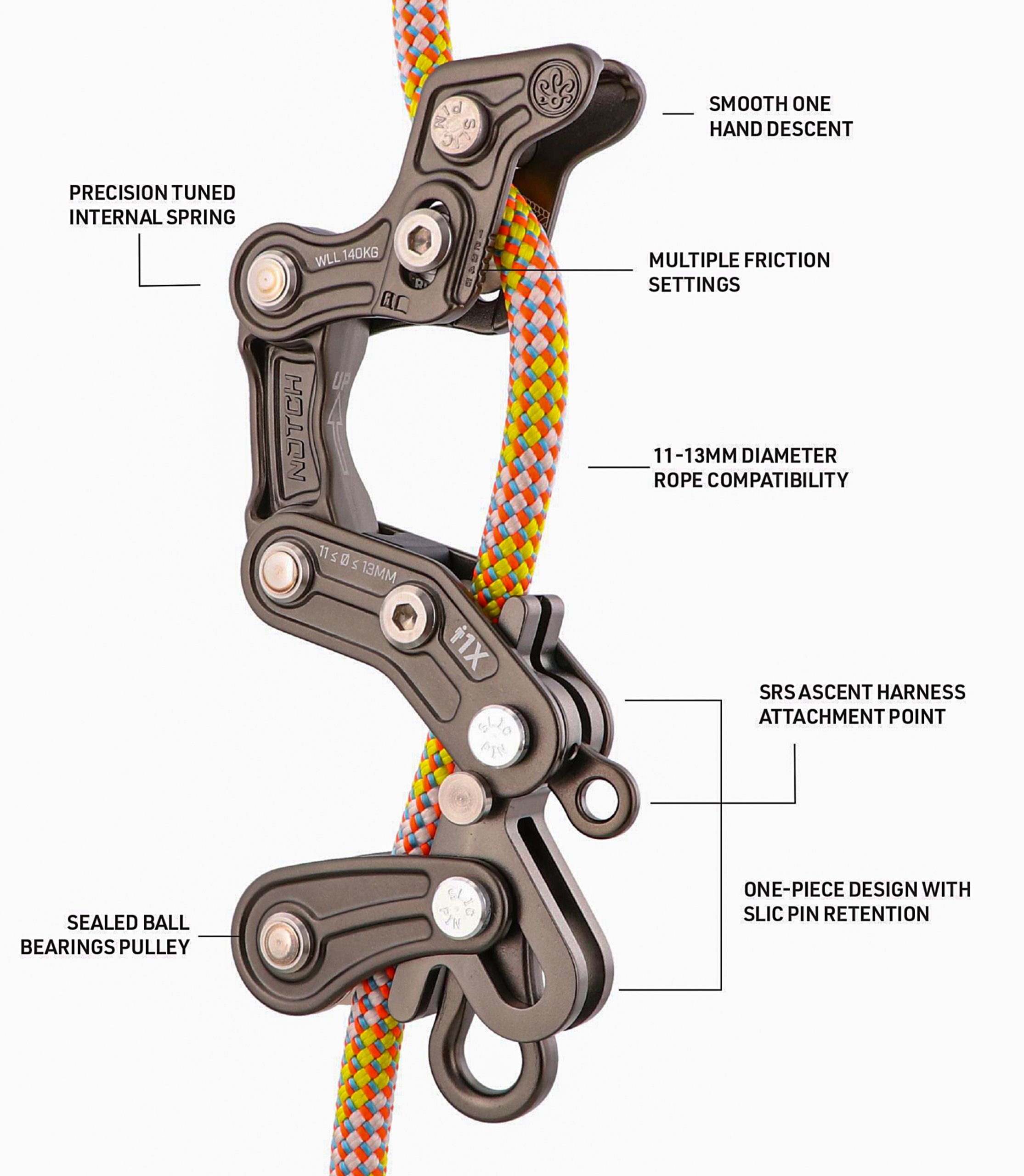 Approved for SRS or MRS climbing, mid-line attachable with a smooth one-handed descent