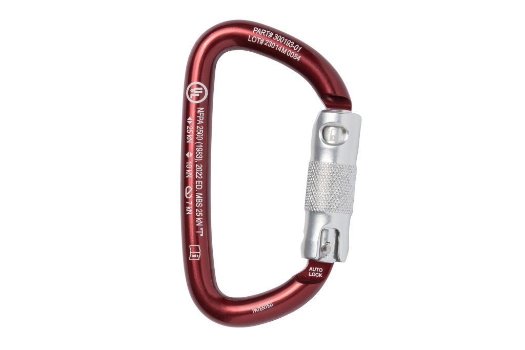 Ideal for rescue and rope access, this anodized carabiner’s patented key-lock design does not hang up when unclipping from your harness or web. An optimized D-shape maximizes its strength, and its wide gate opening fits over 1-inch (25-mm) diameter railings, unusual for a carabiner this compact and light. Safety indicators etched on the gate augment easy one-hand operation. Auto-Lock versions are available with a removable keeper pin for use with lanyards or for terminating escape or RIT lines. Every carabiner is proof loaded. Serial numbers on every carabiner.