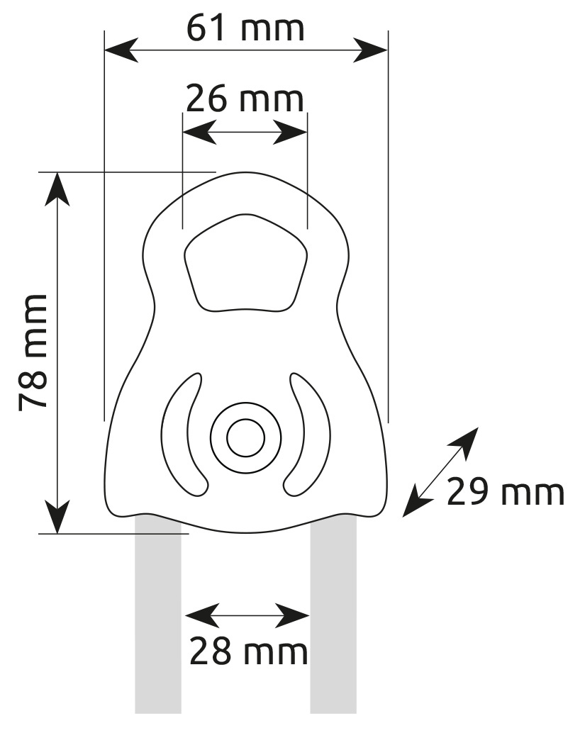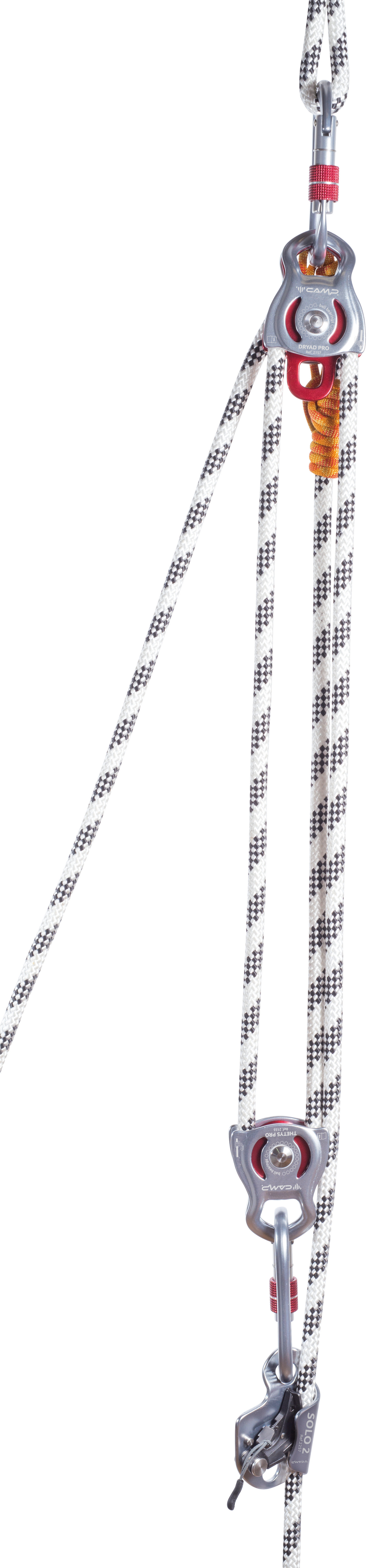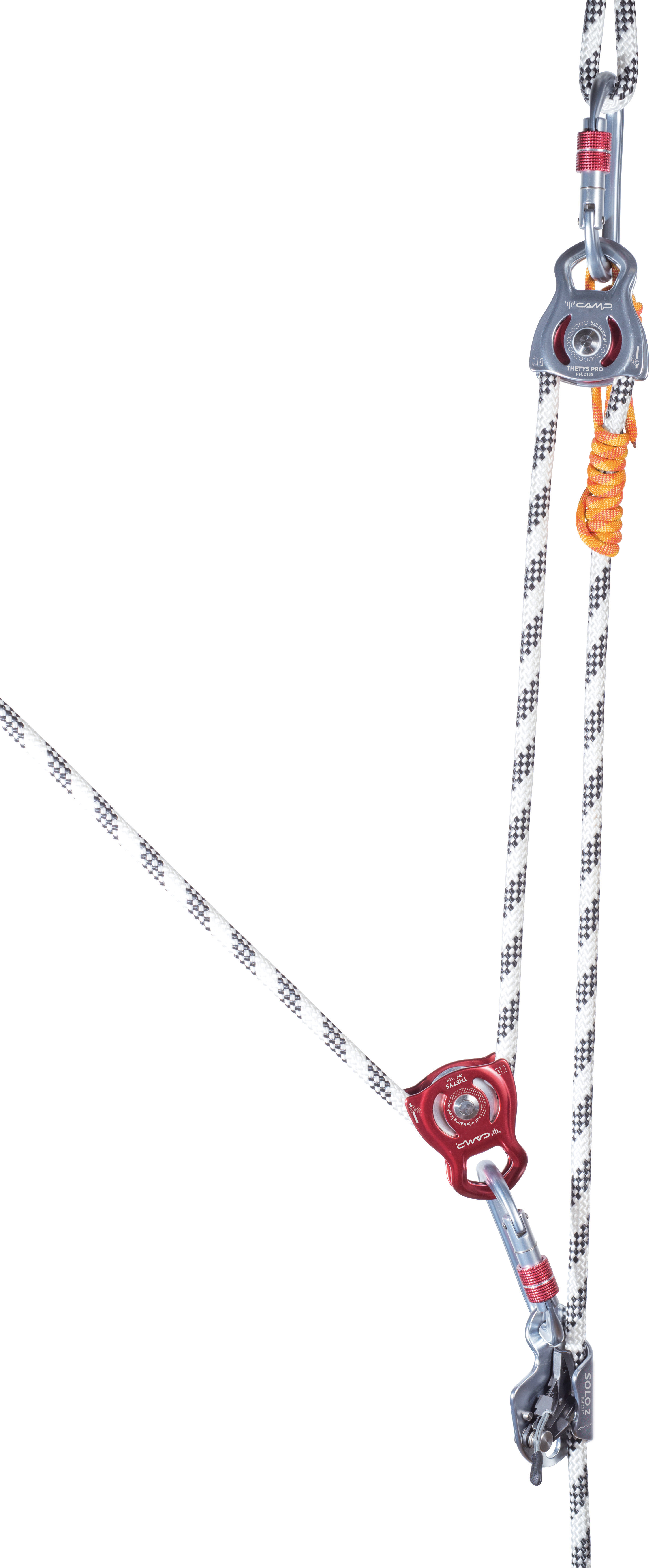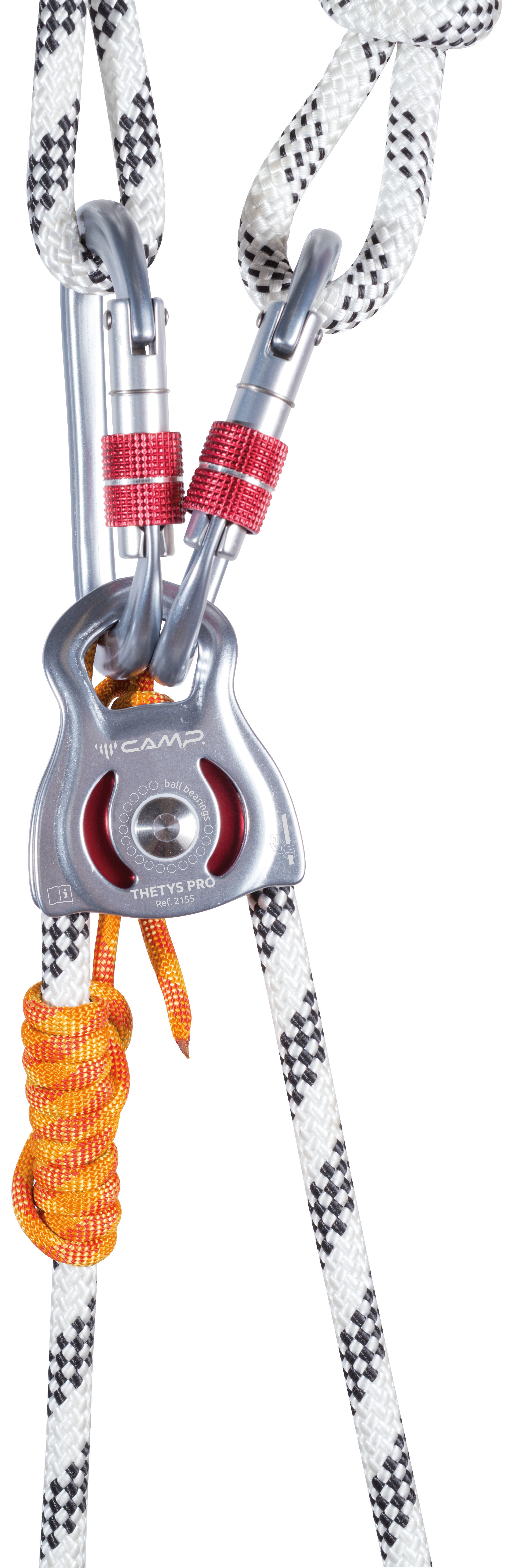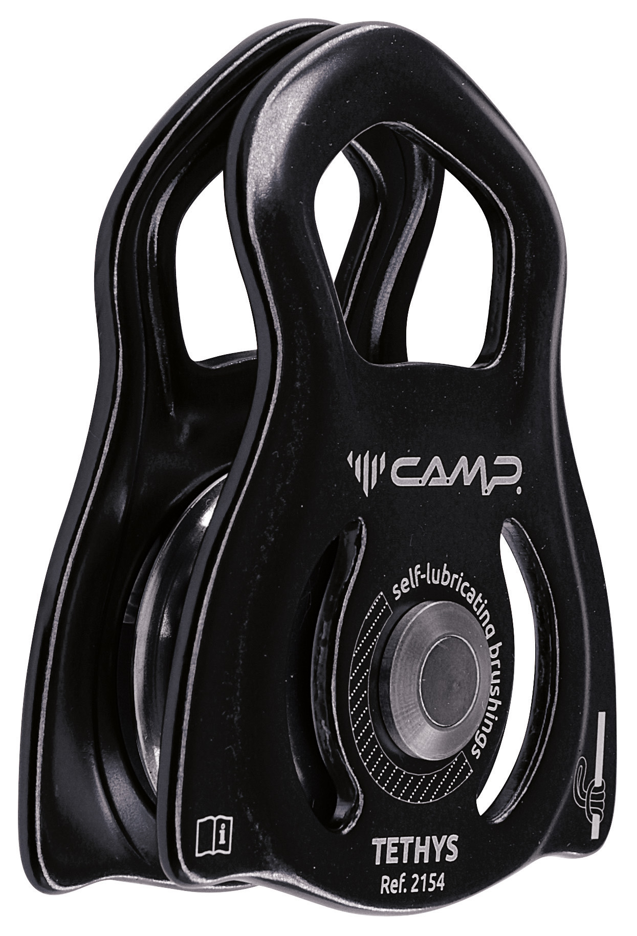 A compact and lightweight pulley with rotating flanges and a large attachment point that accommodates two carabiners.