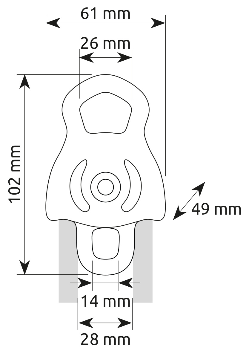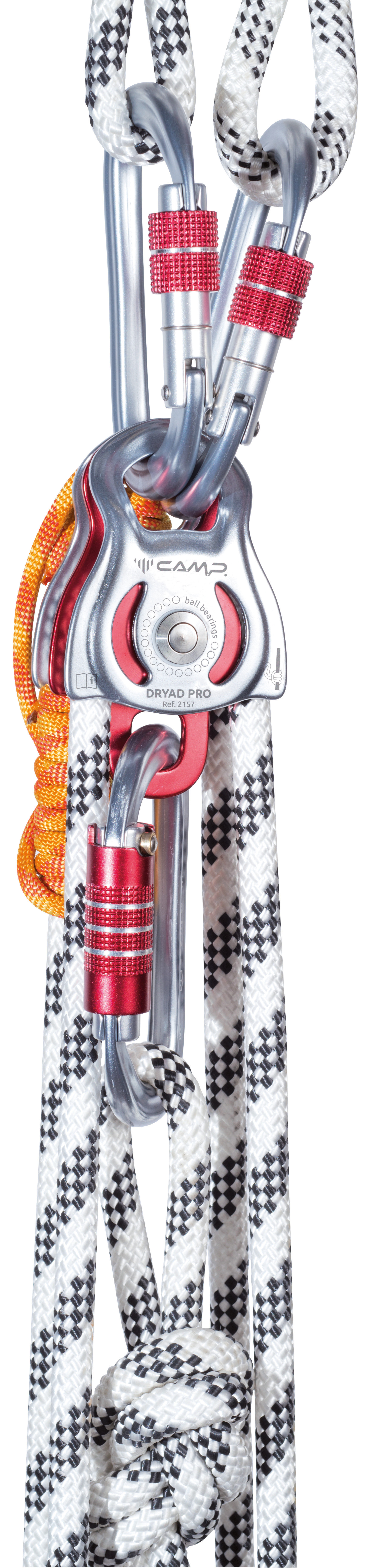 Main attachment point accommodates two carabiners and the becket features a bottom attachment point for linking components in a block-and-tackle system. For use with ropes up to 13 mm. Prusik minding, the self-locking knot can be installed on both sides of both wheels. Self-lubricated brass bushings are sufficient for light applications at low speed. Efficiency: 80%. Aluminum alloy body and wheels, stainless steel axle.