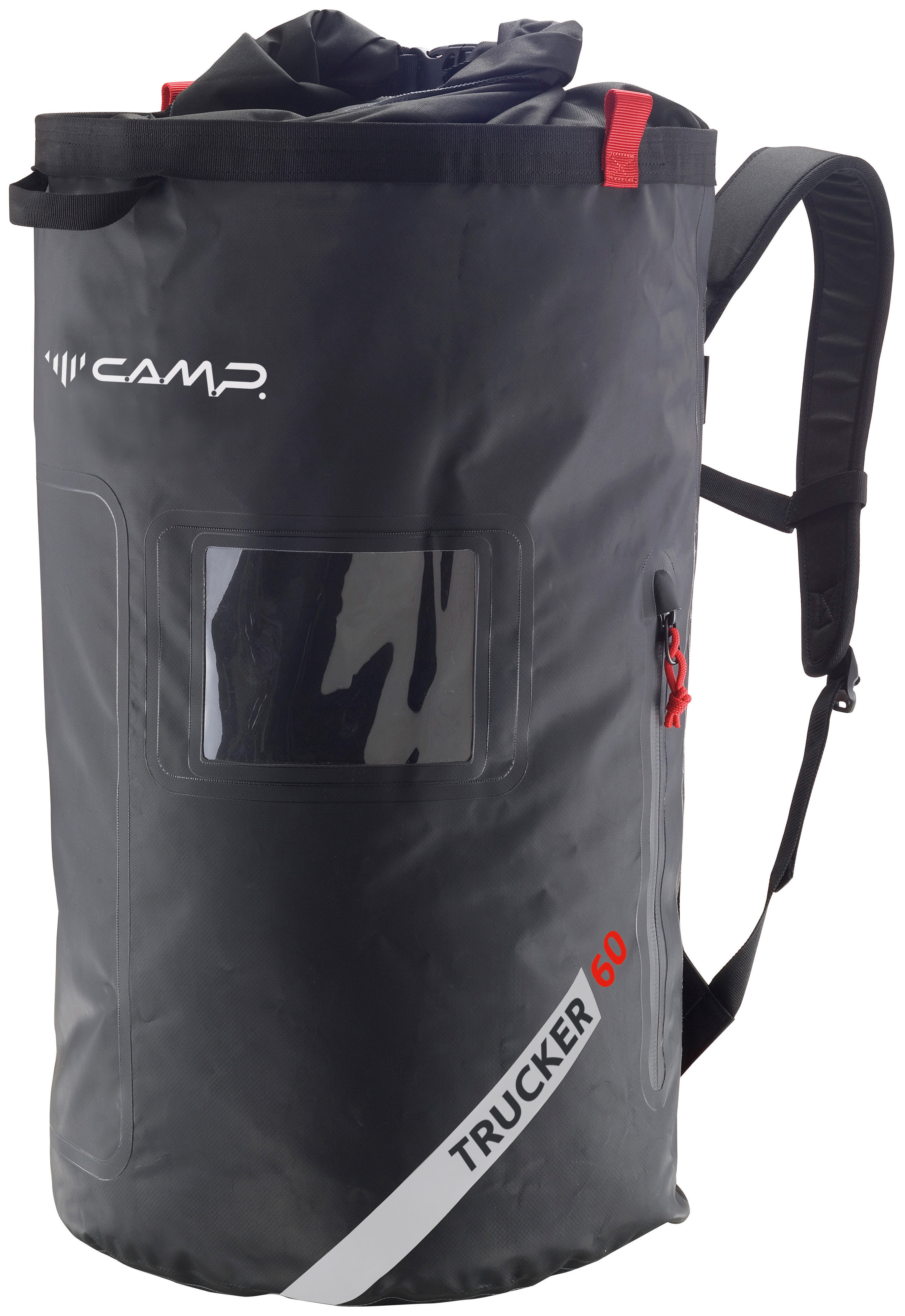 Padded back and shoulder straps. Roll top closure. One external zip pocket and one external zip opening allows access to the lower half of the main compartment. Transparent label pocket. Interior zip pocket, gear loops and loops for fastening rope ends.