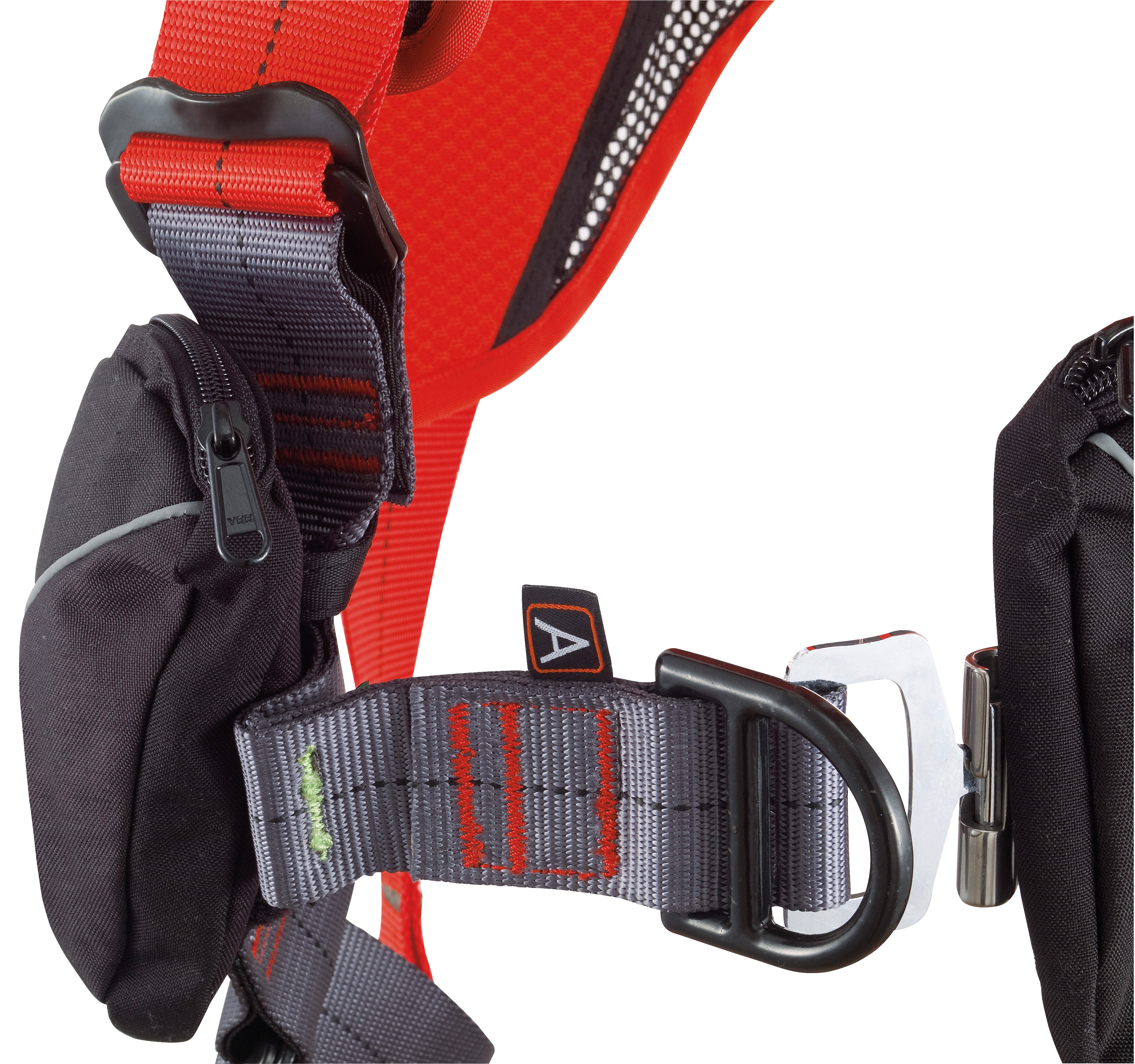 2 steel attachment points for fall arrest with certified load indicators: 1 sternal and 1 dorsal. Two gear loops.
