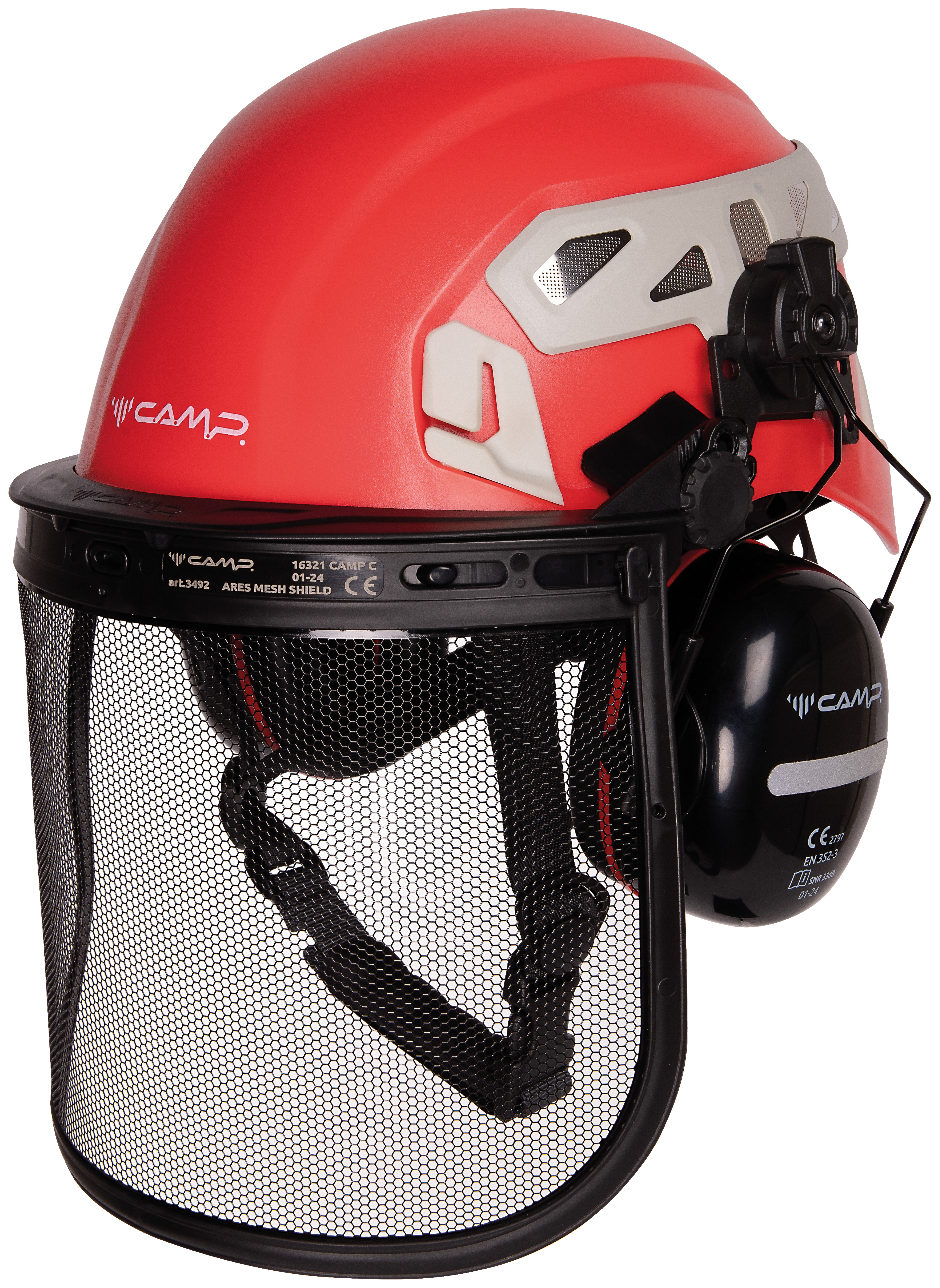 Equipped with attachment points for ear protection, visor and headlamp.